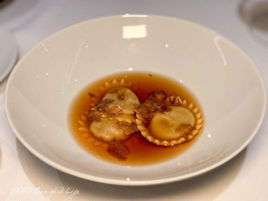 マッシュルームとチキンのお出汁が効いたスープが濃厚であり、懐かしさもあり、とても美味しいスープ!中身がぎゅっとつまったボタンの形をしたパスタと白トリュフが添えてあり贅沢の極み