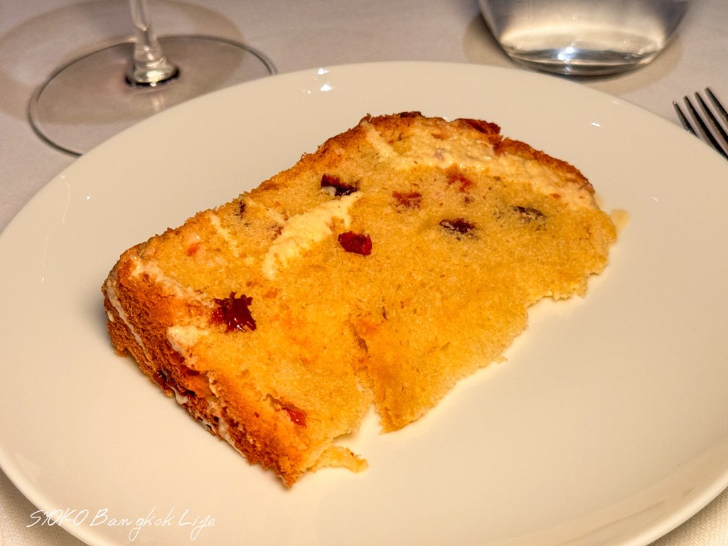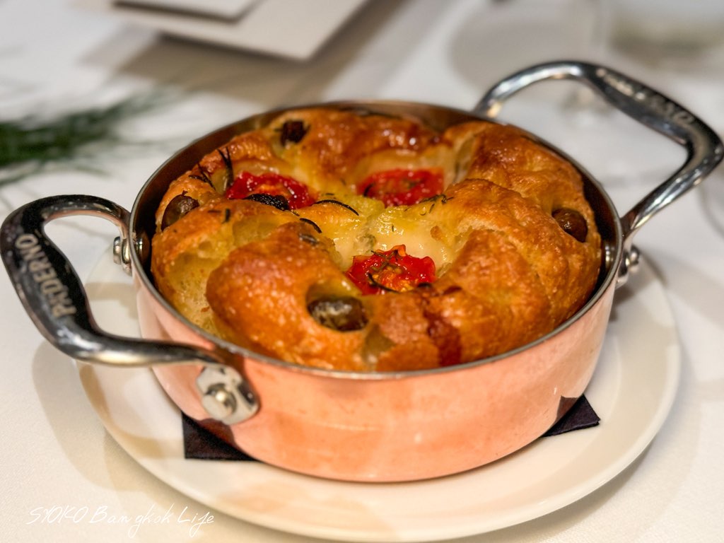 オリーブとドライトマトが入り、ジューシーさも感じるほわほわな生地。このドライトマトが驚くほど甘く美味しくて、オリーブ&バルサミコを混ぜたオイルに浸して食べるひと口目は至福の時です。パンも一緒に来ました。