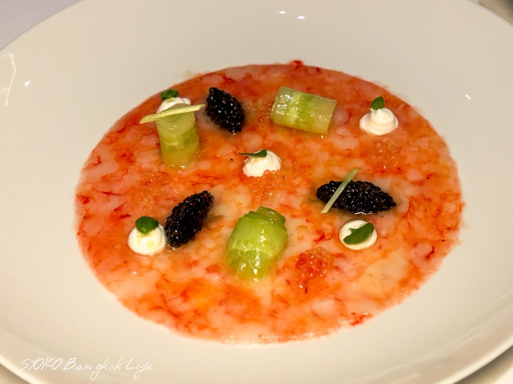 赤エビのセビーチェはテクスチャーがとろとろで、レモンとキャビアの風味と相性が良く、添えられたラティチェロと呼ばれる生クリームのようなものが濃厚さを醸し出しており、爽やかだけど印象にも残るメニュー
