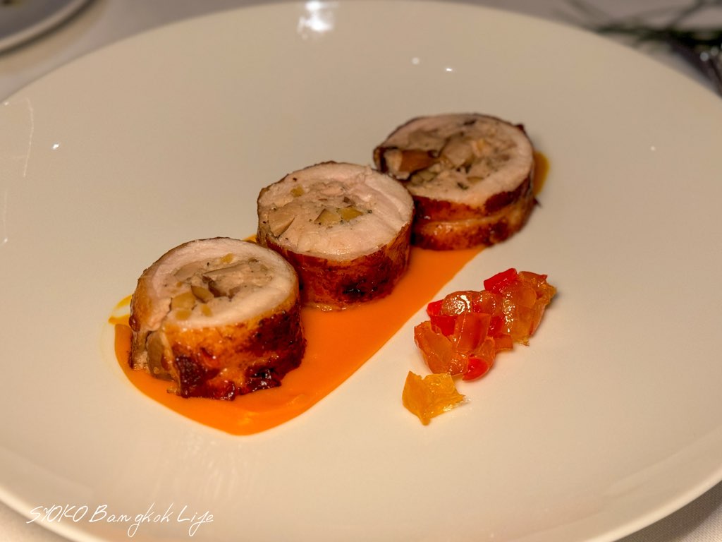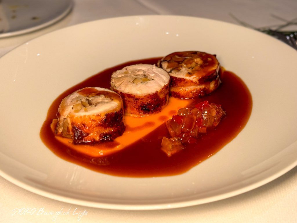 特別な方法で肥育した高級雄鶏肉を使用した、見た目もフェスティブを感じるポルチーニ茸のカポン。先程のお肉と同じ赤ワインベースのソースと同じで、柔らかいテクスチャーが際立つカポン。中の栗はホクホクと歯応えがあり、柔らかいお肉との面白い組み合わせ。添えられたジェリーとラフランスの甘露煮みたいなのを混ぜたものは少しマスタードが効いていて、味変にも最適。