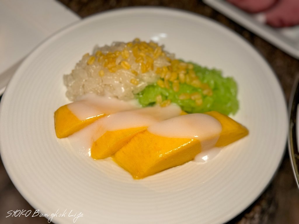 先にスイーツコーナーへ行った主人が、珍しくカオニャオマムアンを持って帰ってきたので、どうしたの?と聞いたら、タイ人も行列で、なんか食べたくなっちゃったと。