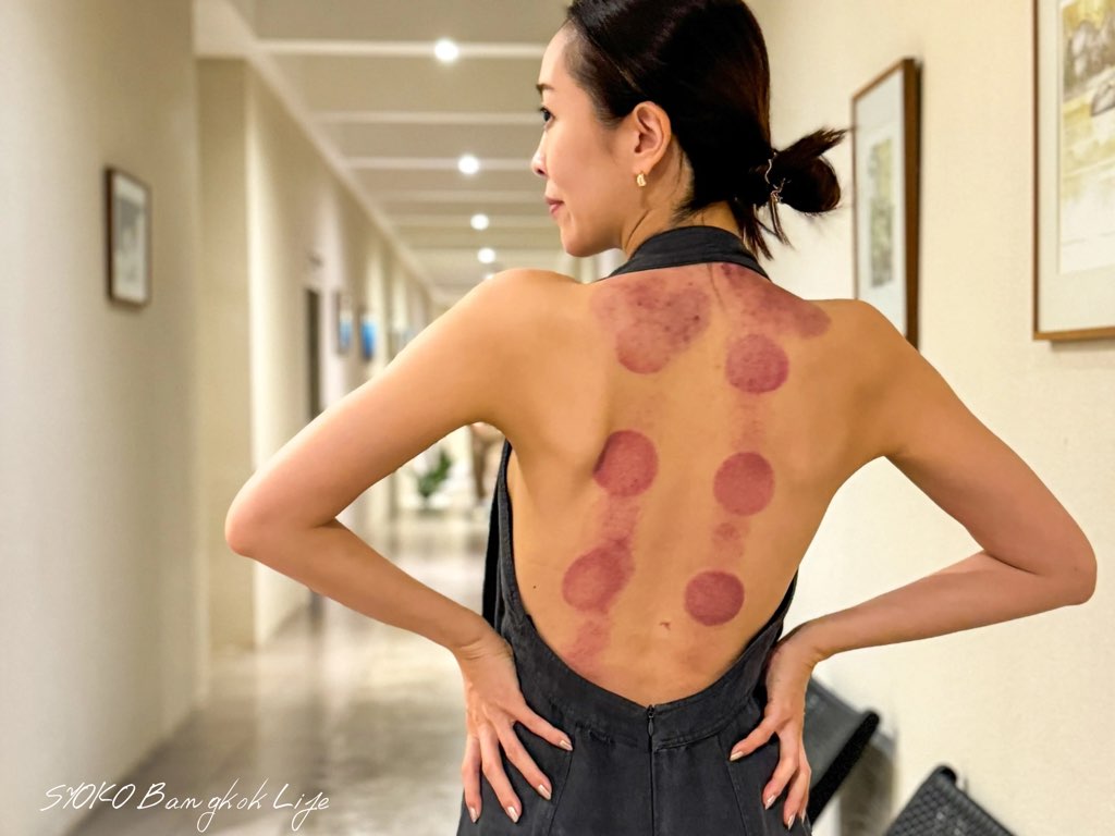 通常のカッピングだけではつかない、滑らせたようなあざがたくさんついていますね。このお陰で、終わったあとの肩と背中の軽さが施術前と雲泥の差!!凄い!!