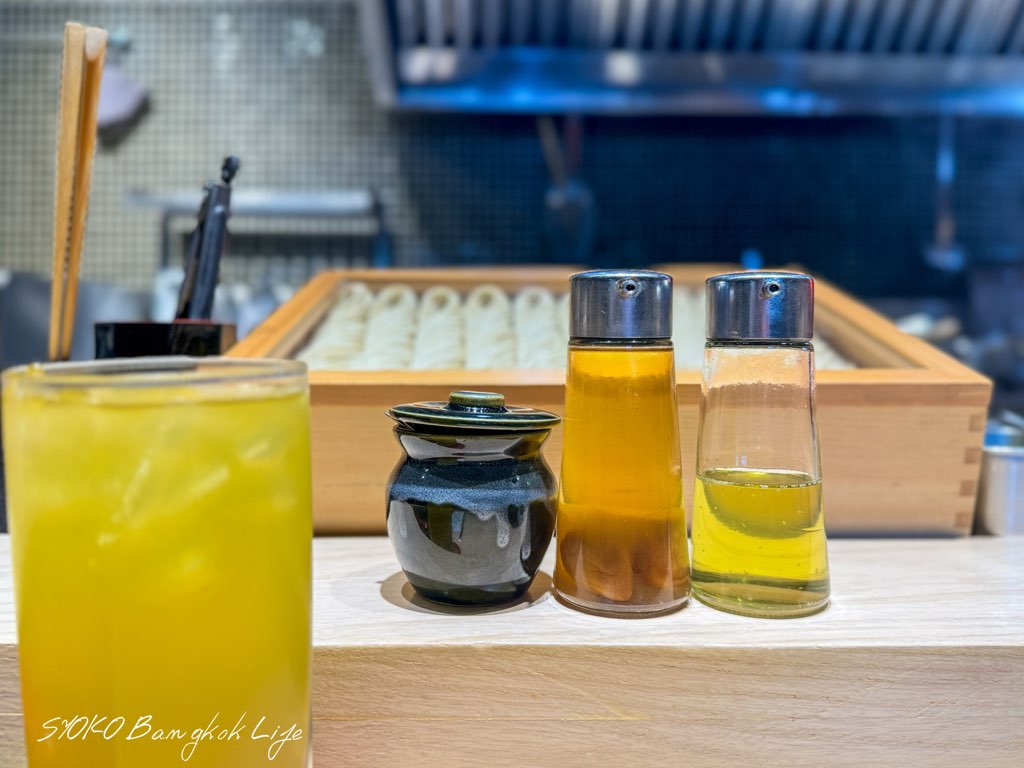 各席の前には味変に使うとされる調味料が並んでおり、右から自家製山椒オイル(Japanese pepper