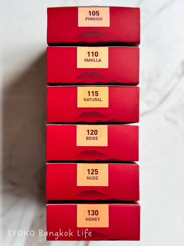 どの色も黄みや赤み、茶褐色に偏りすぎず、タイファンデ色に寄せすぎていない、日本人の肌にも自然になじみやすいラインナップです。