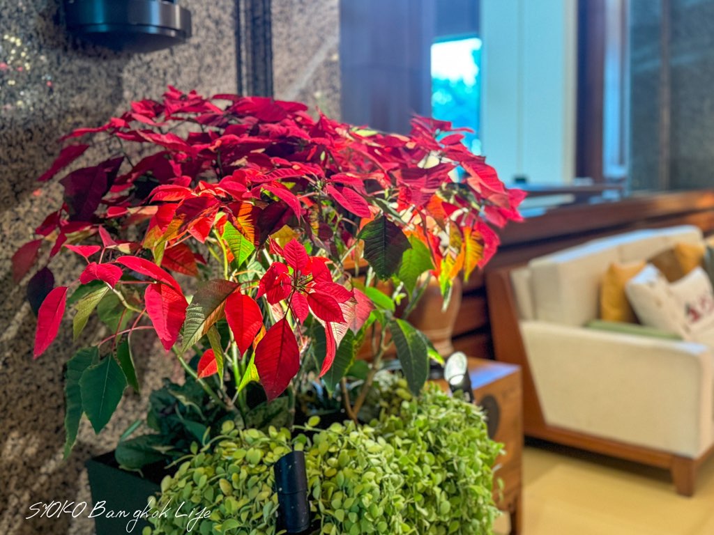 ホテルの至る所に置いてあるポインセチアも鮮やかに馴染んでおり、クリスマスの雰囲気をより一層活気立ててくれます。