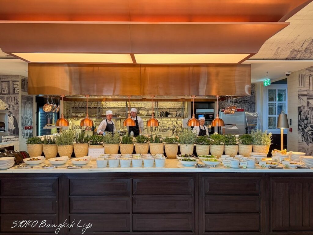 開放感のある空間と、ライブキッチンが特徴で、ビュッフェはとにかく種類が豊富!