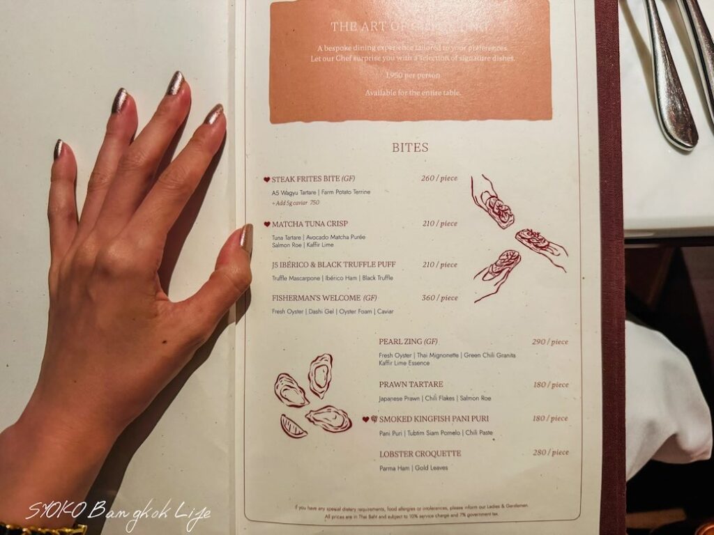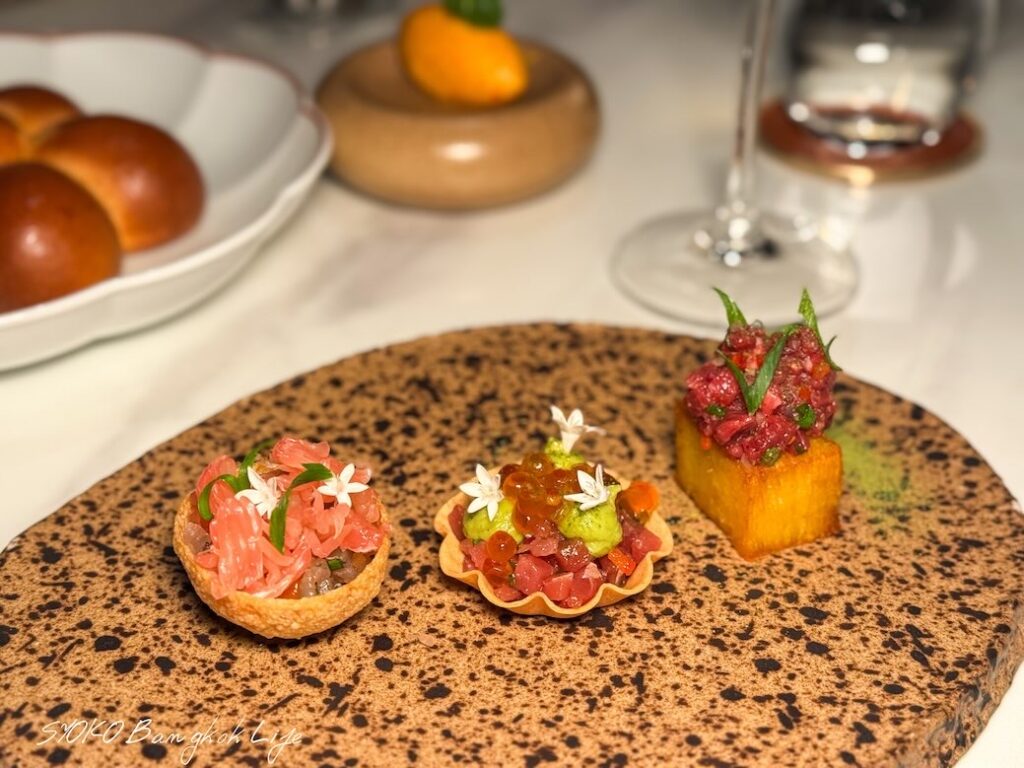 左からSMOKED KINGFISH PANI PURI,MATCHA TUNA CRISP,STEAK FRITES BITE