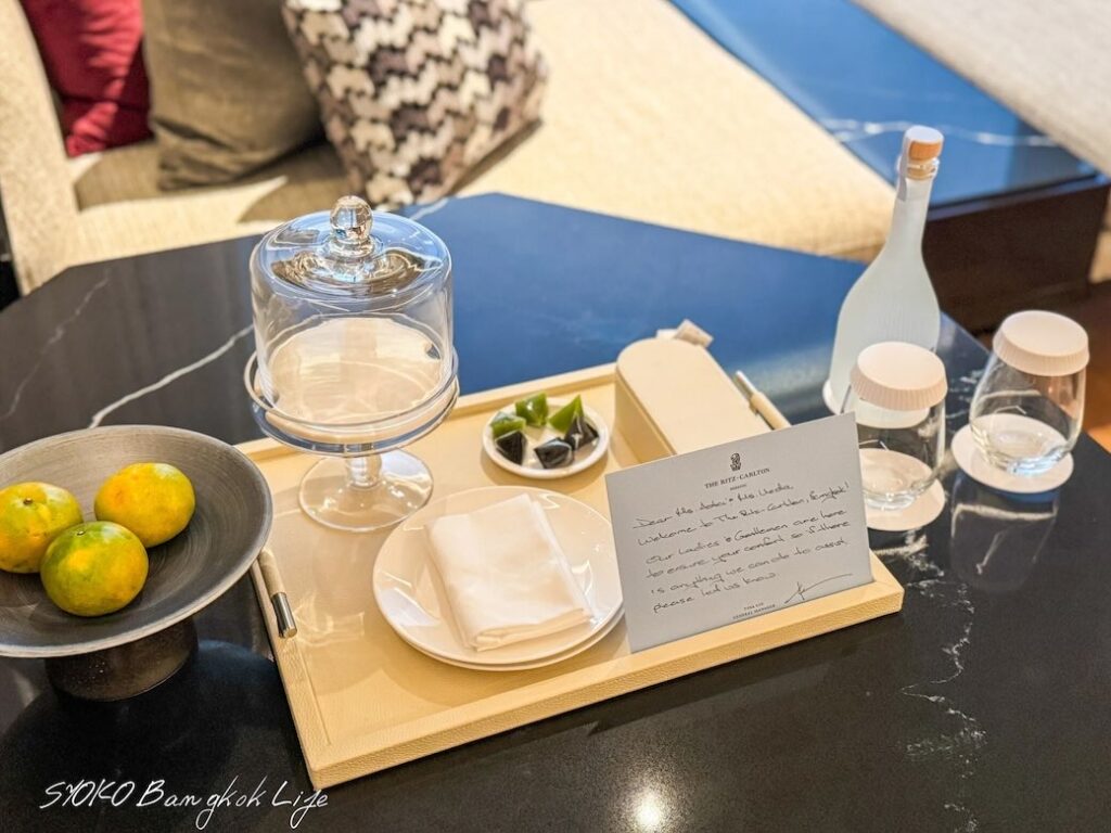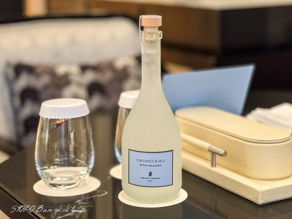 ウェルカムスナックはタイのお菓子キャラメルと、瓶に入ったコラーゲン入りのココナッツウォーター!これはリッツカールトンバンコクオリジナル商品ということで、宿泊者だけが楽しめるスペシャルドリンク。