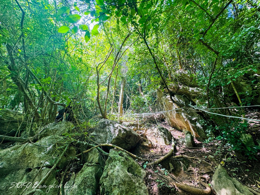 岩場あり、急斜面あり、ほぼジャングル。木の根を掴みながら進むような場面もあり、運動が得意な大人でも息が上がるほどハードです。